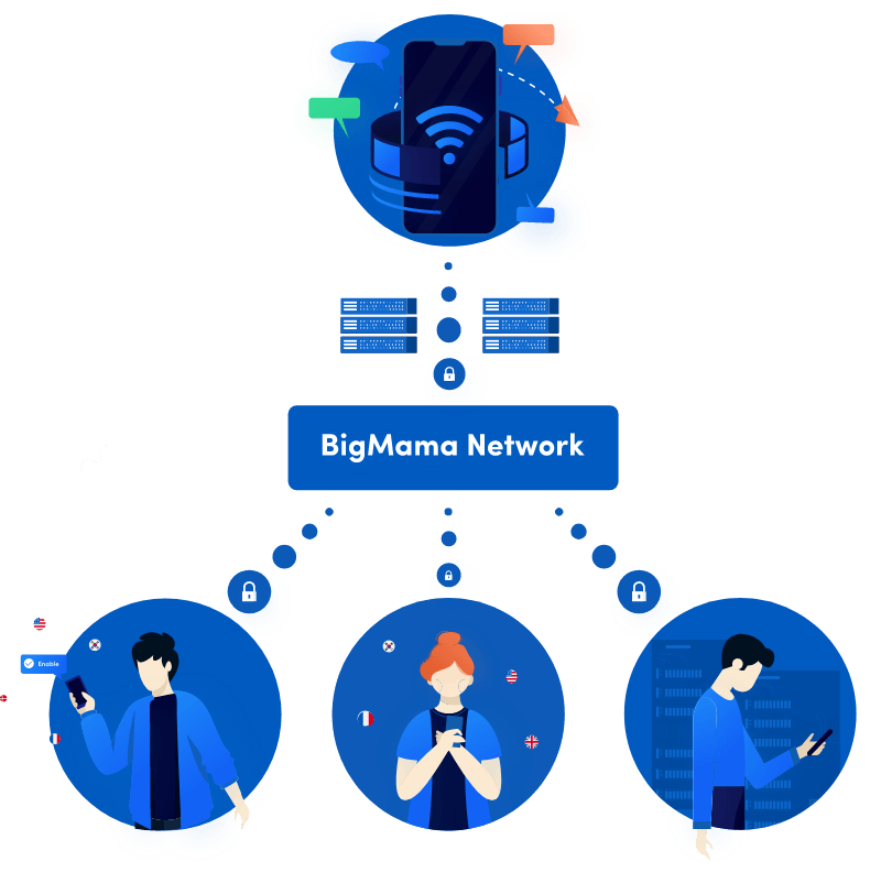 The devices running BigMama VPN are securely bound into an anonymous P2P network. That network can be accessed by our commercial clients who use it for secure global routing of their Internet traffic.